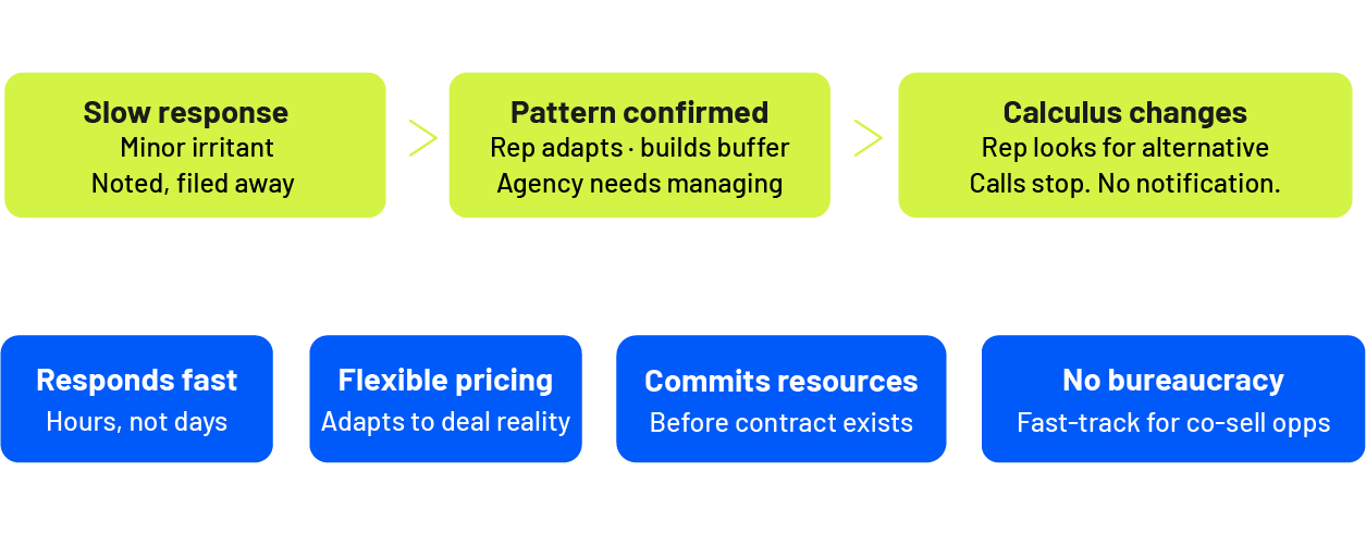 Most agencies have pricing and scoping processes designed for direct client sales. Co-sell situations don't work that way. The deal is already in motion. The rep needs the agency to engage with the commercial realities of that deal — quickly, flexibly.