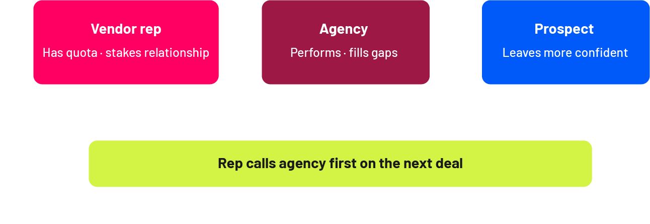 When they bring an agency partner into a deal, they are making a bet. They are telling their prospect — implicitly — that this agency is credible, capable, and aligned with what the vendor is trying to accomplish. They are staking a piece of their relationship with that prospect on the agency's performance.